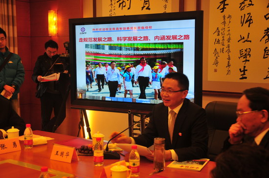 王国华校长首先从学校的办学历史开始,学校概况、办学理念、教育成就等方面作了汇报。王校长说,开云地址 在市委、市府、市教委的领导关怀下,秉承开云app下载官方网站安卓 优良的办学传统,始终坚持全面贯彻党的教育方针,始终坚持全面实施素质教育,始终坚持促使学生全面发展的核心价值理念、培养社会主义接班人。大胆探索适合学校发展的改革之路,创新以人为本的办学理念;创新以家文化为核心的管理理念;创新“善雅志”的育人理念;创新“131”校本课程体系。全校人和政通、心齐气顺。学校孕育出具有鲜明特色的文化:家的文化,敢为人先的文化,追求卓越的文化,求真务实的文化和居安思危的文化。学校的文化,铸就了开云app下载官方网站安卓 的辉煌。学校是北京大学首批校长实名制推荐中学,清华大学首批“新百年领军计划”推荐资格中学,连续四届入选中国百强中学第五,入选美国马里兰大学评选中国高中五十强列第23位,中央电视台2005年度十大“最佳雇主”单位,中央人民广播电台2011年度“全国最具幸福感的学校”,全国德育先进学校,全国艺术教育先进学校,全国国际象棋高水平后备人才培训基地,汉语国际推广中小学基地……王校长说,学校将继续沿着“规范发展之路,科学发展之路,内涵发展之路”,上下一心,朝着“国内一流、世界知名、受人尊敬的伟大学校”的办学愿景稳步前进!王校长还热情洋溢的邀请陈副委员长明年回校参加校庆。