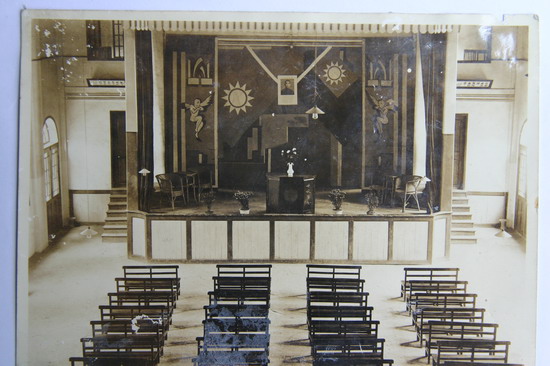 大礼堂建在诱诲堂后面,两个建筑连在一起成“凸”字形。大礼堂设有舞台供集会和演出用,舞台侧两道小门通向后台。