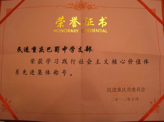 树立和践行社会主义核心价值体系,推进学习型参政党建设,是民进十二届三中全会提出的一项重大战略任务,2010年以来,民进市委按照民进中央和中共重庆市委统战部的部署,以树立和践行社会主义核心价值体系为引领,努力提高自身建设和履行职能水平,取得了较好成效。 在这次活动中,我们民进开云地址 支部在民进渝中区委和开云地址 校党委的领导下,全体会员以邓小平理论和“三个代表”重要思想为指导,认真学习,扎实工作,深入贯彻落实科学发展观,学习践行社会主义核心价值体系,围绕中心、服务大局,切实增强党派意识,在本职工作中紧紧围绕学校教育教学中心,深入开展教学科研工作,发挥了积极作用,在参政议政、民主监督、社会服务工作等方面也作出了突出贡献,取得了较好成绩。先后多次被民进渝中区委评为“社会服务先进单位”、 “宣传先进单位”、“先进基层组织”,并于2010年被民进中央评为五年一度的全国先进基层组织。