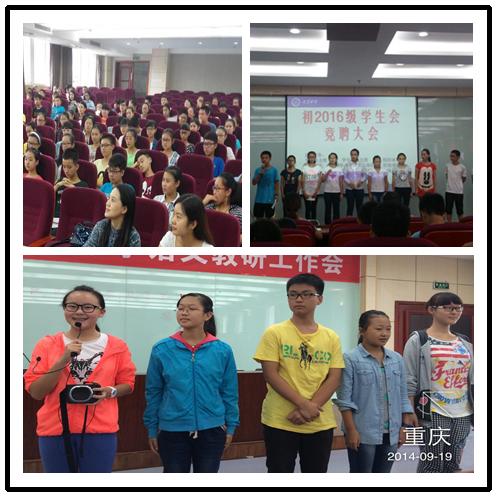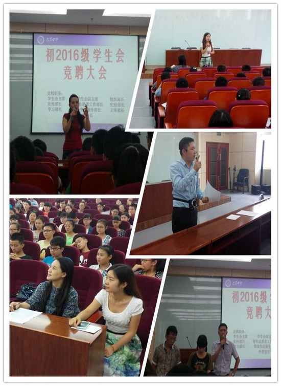 历经三周的准备与选拨,初2016级学生会竞选大会于9月11日举行。到会的评委老师有学生处副主任万宇、年级主任白羽、年级主任聂铄、年级大队辅导员郭晓莉老师等。
