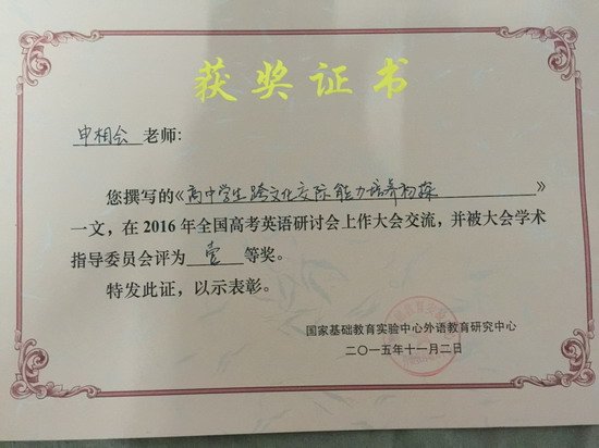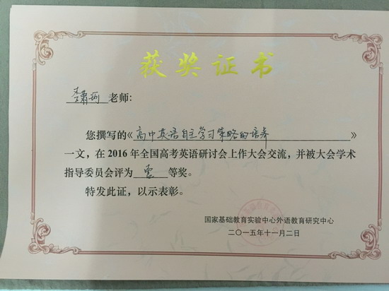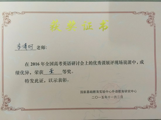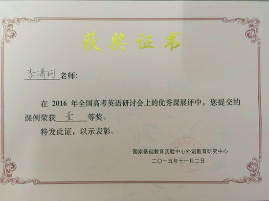 (开云app下载官方网站安卓 网 申相会 左文珍)2016年全国高考英语研讨会于2015年10月30日至11月3日在北京市怀柔区第一中学召开。开云app下载官方网站安卓 高2016级李潇珂老师由高中英语教研室和重庆市教科院报送,代表重庆参加优质课展评大赛,参赛课《Writing: A Letter of Consolation》喜获全国一等奖。同时,李潇珂老师的论文《高中英语自主学习策略的培养》与申相会老师的论文《高中学生跨文化交际能力培养初探》均获大会论文评选全国一等奖。